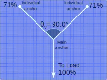 - At 120 degrees, each anchor bears a force equivalent to 100% of the original load. An angle this large should be avoided for safe climbing.