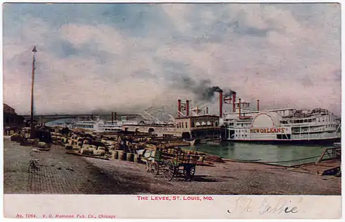 | City of St. Louis | 1883 | Measured 300 feet (91 m) long x 49 feet (15 m) wide x 8.6 feet (2.6 m) depth (hull). In 1894 she was commanded by Captain James O'Neal, with pilots Joe Bryan and Charlie O'Neal. In March 1898 she was bought at the U.S. marshal sale at St. Louis by Captain W.H. Thorgewan for $19,050 (about $422,0064 in 2005). Briefly owned afterwards by the Columbia Excursion Company, which sold the boat in July 1899 to James M. Grasty. By 1901 she was running harbor excursions in New Orleans, and U.S. President William McKinley rode on the boat in May. Grasty sold the boat in 1903 to the Greater New York Home Oil Company; however, a U.S. marshal took control of the boat and sold her to T. Marshall Miller, an attorney, for $3,125 (2005 $66,573). Laid up at Carondelet, Missouri, she burned there 29 October 1903. The original roof bell was sold by the Anchor Line to Captain J. Frank Ellison, and it was later installed on a boat known as the Queen City. |