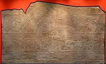Assyrian siege of an Egyptian fortified city, a scene from the Assyrian conquest of Egypt, probably referring to the capture of Memphis in 667 BC. Sculpted in 645–635 BC, under Ashurbanipal. British Museum.[56]
