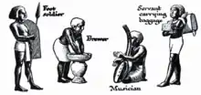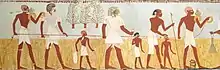 Egyptian society was highly stratified, and social status was expressly displayed. Farmers made up the bulk of the population, but agricultural produce was owned directly by the state, temple, or noble family that owned the land.[77] Farmers were also subject to a labor tax and were required to work on irrigation or construction projects in a corvée system.[78] Artists and craftsmen were of higher status than farmers, but they were also under state control, working in the shops attached to the temples and paid directly from the state treasury. Scribes and officials formed the upper class in ancient Egypt, known as the "white kilt class" in reference to the bleached linen garments that served as a mark of their rank.[79] The upper class prominently displayed their social status in art and literature. Below the nobility were the priests, physicians, and engineers with specialized training in their field. It is unclear whether slavery as understood today existed in ancient Egypt; there is difference of opinions among authors.[80]