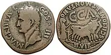From around the mid-first century BC, the number of towns emitting coins decreased and Latin legends were standardised throughout the Peninsula.[40] Coins were mainly now emitted by more important towns that had received privileged juridical status from victorious Roman generals in the Civil Wars and then from the new Julio-Claudian emperors Augustus and Tiberius. Many of the coins emitted proclaim the new status of emitting towns as Roman coloniae or municipia, and individual civic iconography was used with strong similarities to that used in other Roman provinces and media.[41] These emissions are conventionally called (Roman) Provincial coins. The main catalogue for these coins is Volume I of the Roman Provincial Coinage (RPC).[3]