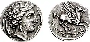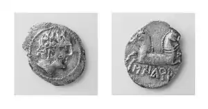 Along the east coast and particularly in the northeast a great number of towns minted silver drachmas. Some of these coins imitate the drachmas of Emporion or Massalia, while others have Iberian legends, a few of which can be related to towns or peoples but many of which are unknown or illegible.[25] This silver coinage is generally seen as minted by the pro-Roman side, particularly as little Roman coin seems to have reached the Peninsula given the concurrent fighting in the Italian Peninsula.[26] But given the fluid situation of the war, particularly in the early years, some of these emissions may have been minted to aid the Carthaginian cause.[27]