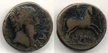 To fund their war effort, the Carthaginians minted gold, electrum, silver and bronze coins.[23] These coins may have been minted in the Barcid 'capital' of Carthago Nova or perhaps were minted simply in Carthaginian military camps. In addition to these coins and those of Gadir and Ebusus, Phoenician colonies along the south coast such as Malaka and Sexi also minted bronze coins.[24]