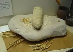 Bread-making began with the milling of the grain. It was a difficult and time-consuming task performed by women. Each household stored its own grain, and it is estimated that it required at least three hours of daily effort to produce enough flour to make sufficient bread for a family of five. The earliest milling was performed with a pestle and mortar, or a stone quern consisting of a large lower stone that held the grain and a smooth upper stone that was moved back and forth over the grains (Numbers 11:8). This often left small pieces of grit in the flour. The use of the millstone became more widespread during the Iron Age, resulting in greater speed and increased production of flour. Smaller versions for household use, the rotary or beehive quern, appeared during the early Persian period.[10][14] After the grain was milled into flour, it was mixed with water and kneaded in a large trough. For dough made with wheat flour, starter, called seor, was added. The starter was prepared by reserving a small portion of dough from a previous batch to absorb the yeasts in the air and thus help leaven the new dough. Seor thus gave the bread a sourdough flavor.[14]