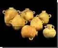 Chickpea cultivation dates back to the Bronze Age (3300 – 1200 BCE)[8] and grapes and olives became important crops in the hill country. Wine and oil were traded for wheat with the cities on the coastal plain, and for meat and skins with semi-nomadic herders. Wine and carobs were also exported to Egypt during this period. At Arad in the northern Negev, the remains of wheat, barley and legumes have been found, along with stone-lined storage pits for grain from this period. Pottery was imported from Cyprus and Mycenae in Greece for the first time, probably for use as good-quality tableware. After the Bronze Age collapse of urban culture, there was an increase in herding and the disappearance of smaller agricultural communities.[7]