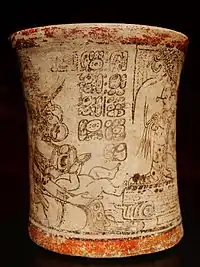 Unlike utility ceramics found in such large numbers among the debris of archaeological sites, most of the decorated pottery (cylinder vessels, lidded dishes, tripod plates, vases, bowls) once was 'social currency' among the Maya nobility, and, preserved as heirlooms, also accompanied the nobles into their graves.[37] The aristocratic tradition of gift-giving feasts[38] and ceremonial visits, and the emulation that inevitably went with these exchanges, goes a long way towards explaining the high level of artistry reached in Classical times.