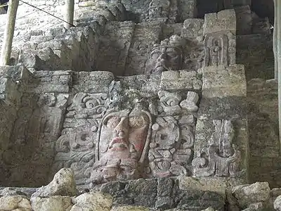 Several solutions for dividing up and ordering the stuccoed surfaces of buildings were applied, serialization being one of them. The Early Classic walls of the 'Temple of the Night Sun' in El Zotz consist of a series of subtly varied deity mask panels, whereas the frieze of a Balamku palace, also from the Early Classic, originally had a series of four rulers enthroned above the open ophidian mouths of four different animals (a toad among them) associated with symbolic mountains. Conversely, friezes may be centered on a single ruler again sitting on a symbolic (maize) mountain, such as a frieze from Holmul, with two feathered serpents emanating from below the ruler's seat, and another one from Xultun, on which the ruler carries a large ceremonial bar with emerging jaguar-like figures.[23] An Early-Classic temple frieze from Placeres, Quintana Roo, has the large mask panel of a young lord or deity in the middle, with two lateral 'Grandfather' deities extending their arms.