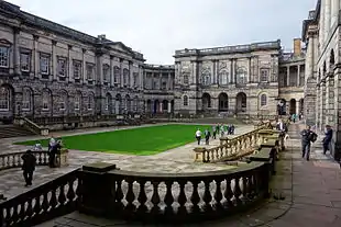 Founded by the Edinburgh Town Council, the university began as a college of law using part of a legacy left by a graduate of the University of St Andrews, Bishop Robert Reid of St Magnus Cathedral, Orkney.[10] The university was established by a royal charter granted by James VI in April 1582,[11] and instruction began under the charge of theologian Robert Rollock in October 1583.[12] As the first Scottish university to be founded by royal charter at the urging of the 'town council and burges of Edinburgh', rather than through papal bulls as had been the case for the three older universities, this set a new precedent. Despite this difference, it is universally considered one of the seven ancient universities of Britain and Ireland (and ten years older than the youngest ancient university, the University of Dublin), a status affirmed by the Scottish Government.[13]