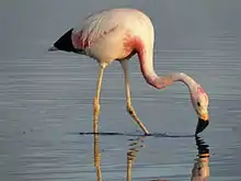 The flamingos feed from the bottom layer of the lake for small particles, mainly diatoms.[10] They have a deep-keeled bill; the upper mandible is narrower than the lower, creating a gape on the dorsal surface of the bill.[11] The bill morphology facilitates feeding of diatoms through inertial impaction. This mechanism entails that food particles denser than water, such as diatoms, would impact the filtering surface in the bill, causing water to flow out of the mouth and leaving diatoms in the flamingo's bill.[10] The flamingos forage in shallow salty waters for resources. They exhibit the most flexible foraging pattern compared to that of the Chilean and James's flamingos.[12]