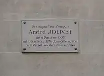 Jolivet died in Paris in 1974 aged 69, leaving unfinished his opera Le Soldat inconnu. He was buried at Montmartre Cemetery next to the composer Henri Sauguet (section 27, near the grave of Hector Berlioz).