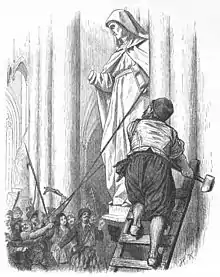 They heaped such insults on the images of the saints, and the crucifix itself, that it is quite surprising there was no miracle. ... Not a statue was left either in the churches, or the vestibules, or the porches, or the monasteries. The frescoes were obliterated by means of a coating of lime; whatever would burn was thrown into the fire, and the rest pounded into fragments. Nothing was spared for either love or money.[6]