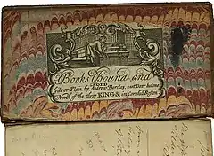 Barclay was one of a group of Scottish bookbinders and booksellers who, at the age of 21, emigrated to the colonies and worked in Boston before and during the War for American Independence. His brother John arrived at Boston six years thereafter.[4] A small percentage of bookbinders ever distinguished their work by including their signature trade label on the inside cover of the works they bound. Subsequently bookbinder's trade labels are seldom found in the various works that were published in eighteenth-century colonial America. The various works bound by Andrew Barclay containing such labels are considered among the rare exceptions to that advent, with only a few known surviving examples.[5] Historians in this field have searched the rare book departments in various public and university libraries for these labels and have only found several examples. They maintain that the books containing binder's trade labels have largely gone unnoticed or unidentified and hope that more examples are yet to be found pending continued searches.[6]