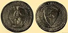 Andrew held an assembly of the prelates, noblemen, Saxons, Székelys, and Cumans in Pest in the summer of 1298.[43][44] The preamble to the decrees that were passed at the diet mentioned "the laxity of the lord king".[15][45] The decrees authorized Andrew to destroy forts built without permission and ordered the punishment of those who had seized landed property with force, but also threatened Andrew with excommunication if he did not apply the decrees.[46] At the gathering, he appointed his uncle, Albertino Morosini, Duke of Slavonia.[45] After the close of the diet, Andrew entered into a formal alliance with five influential noblemen – Amadeus Aba, Stephen Ákos, Dominic Rátót, Demetrius Balassa and Paul Szécs – who stated that they were willing to support him against the Pope and the bishops.[47][48] Gregory Bicskei, the archbishop-elect and apostolic administrator of Esztergom, forbade the prelates to participate at a new diet which was held in 1299.[47][49] The prelates ignored the archbishop's order and Andrew deprived him of Esztergom County.[50][49]