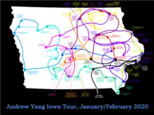 According to The Des Moines Register Candidate Tracker, Yang appeared at 78 events in Iowa in January and 14 events in Iowa in February.[49] The Iowa caucus ended without the declaration of a winner due to questions surrounding discrepancies over vote counts.[50] Yang received 8,914 votes in the first alignment in Iowa, which was 5.1% of all votes cast. In the second alignment, Yang received 1,758 votes, which was 1.0% of all votes cast. Yang received 22 state delegate equivalents, which was 1.0% of all state delegate equivalents available. He did not win any delegates to the national convention.[51] Yang's campaign fired 130 staffers in the aftermath of the Iowa caucus. Zach Graumann, Yang's campaign manager, said that the layoffs were part of a "natural evolution" of the campaign after Iowa. A spokesperson for the campaign stated that the layoffs were unrelated to negotiations between the campaign and its unionized workers.[52]