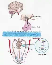 - The synthesis of testosterone is mediated by a chain of processes that start in the brain. When the body detects a low level of testosterone, the hypothalamus starts to produce LHRH. LHRH activates the synthesis of LH (Luteinizing hormone) within the pituitary gland. LH induces testosterone synthesis within the testicles.[10] There are two different medicines, LHRH agonists and antagonists, which both lower the amount of testosterone made by the testicles. They work by inhibiting the formation of LH in the pituitary gland. The LHRH agonists produce a sudden increase on levels of testosterone followed by a huge falling, process called flare, whereas LHRH antagonists decrease directly the amount of testosterone. LHRH agonists and antagonists used in androgen deprivation therapy include leuprorelin (leuprolide), goserelin, triptorelin, histrelin, buserelin, and degarelix.