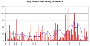 Flower was born in Cape Town, South Africa,[6] and starting from his high school days at Oriel Boys' High School and Vainona High School played most of his career alongside his younger brother Grant Flower. He is considered to be one of the best wicket-keeper batsmen, alongside players such as Adam Gilchrist, Kumar Sangakkara, MS Dhoni and Kamran Akmal.[7] Flower made his international debut in a One Day International against Sri Lanka at New Plymouth, New Zealand, in the 1992 Cricket World Cup. A good player of spin, he made 550 runs in a Test series against India in 2000/01. This tally came in just four innings and he was only dismissed twice. He is one of the few players to score a century on ODI debut and became the first player ever to score a century on ODI debut in a World Cup match.[8]