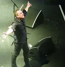 McCluskey developed a popular and distinctive onstage dance routine, dubbed by the BBC's Stuart Maconie as the "Trainee Teacher Dance".[9][10] Rock trio ZZ Top, who shared a studio with OMD on a 1980 edition of BBC2 show The Old Grey Whistle Test, adopted the routine as part of their live set (and also played OMD's self-titled debut album over the PA prior to concerts).[10][11] Maconie wrote that the "jerky, leg-snapping" dance became "the dance-floor routine of choice" for teaching students in the early-to-mid 1980s.[12] Rolling Stone observed "the infectious manic energy of [OMD] frontman Andy McCluskey, a walking encyclopedia of New Wave dance moves".[13] McCluskey said: "I find that it becomes part of the show. It's got to a point where I am now in a shamanistic shaking ritual. I just get physically involved."[9] He explained the genesis of his "legendary" dancing in the Scotsman, saying that it stemmed "from the perception that we were making boring robotic intellectual music that you couldn't dance to. I was trying to say, 'No, no, you can dance to it, look, I'm dancing to it - there's energy, passion'.[14]