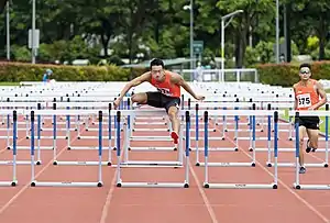 In 2015, Ang ran 14.44s to set the national record for the 110m hurdles, which he bettered the same year during the 2015 SEA Games (14.38s).[6] In 2017, he clocked 14.19s at the Thailand Open—after putting his medical studies at NUS on hold—but the record was not ratified.[3] In 2019, he broke the national mark thrice: twice during the Singapore Open (14.27s and 14.26s) and once during the Asian Athletics Championships in Doha (14.25s).[7]