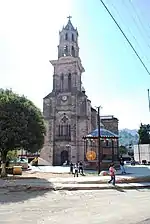 The main plaza is flanked by two churches: the parish of San Simón and the Inmaculada Concepcíon.[2] The clocks on the two churches often show different times.[6] The Inmaculada Concepción church was built by a single family, in pink stone in Gothic style to imitate in miniature the Notre Dame Cathedral in Paris. The main altar was made of marble from Italy, with images of Saint Joseph and the Virgin Mary from Paris. The tabernacle contains the “chalice of Angangueo,” an important example of Baroque silverwork.[3] The San Simon parish is smaller, built with blue-grey stone. Other chapels include Santa Maria Gorita, Misericordia and Jesus Nazareno.[7]