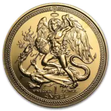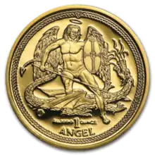 Reverse: Shows Archangel Michael fighting the dragon. In small lettering beneath the dragon, metal content, coin size and fineness are given. The design is framed by an elaborate Viking knit motif border with the island's coat of arms, the triskele, appearing at the top, above the ship's flag. The motif of Michael or a Saint slaying a dragon is found in other coins. Michael is used in Ukraine's Archangel Michael gold and silver bullion coins. Russia's Saint George the Victorious bullion coins show Saint George slaying a dragon. The United Kingdom's Sovereign gold bullion also show Saint George fighting a dragon. There have been three primary designs for the Angel. From 1984 to 1993, the Angel faced left. From 1994 to 2007, the Angel faced right. In 2008 and from 2010 to 2015, the Angel still faced right, but in a more upright position. The Angel changed back to the left facing pose starting in 2016. Some left facing coins were produced in 2014. The 2009 version of the coin had three different designs that haven't been produced before or since.