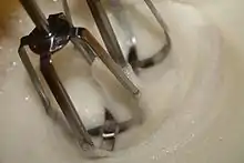 A planetary mixer, such as a stand mixer or handheld mixer, is appropriate for a homemade or bakery cake. If the cake is being mass-produced, a continuous mixer is preferred.[8] There are three methods in which the cake can be made at home or in a commercial setting. The first two methods are most commonly used at home or in a small bakery using planetary mixers in various sizes.[6] Large planetary mixers may have a vacuum in order to pressurize the ingredients. This allows for control of the emulsion and temperature.[8]
