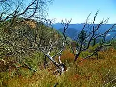 ![]() The San Gabriel Mountains, part of the Angeles National Forest. The southwest view from Islip Saddle shows Bear Creek, a tributary of the San Gabriel River that lies within the San Gabriel Wilderness, and Twin Peaks 7,761 feet (2,366 m). | |