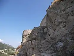 Angelokastro (Greek: Αγγελόκαστρο (Castle of Angelos or Castle of the Angel); Venetian: Castel Sant'Angelo) is a Byzantine castle on the island of Corfu,[1][2][3][4][5] Greece. It is located at the top of the highest peak of the island's shoreline in the northwest coast near Palaiokastritsa and built on particularly precipitous and rocky terrain. It stands 1,000 ft (305 m) on a steep cliff above the sea and surveys the City of Corfu and the mountains of mainland Greece to the southeast and a wide area of Corfu toward the northeast and northwest.[2][6]
