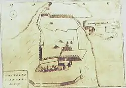 The name may be related to the Komnenoi Angeloi, Despots of Epirus.[8] The earliest textual reference to the castle is in an Angevin document of 1272,[3] which refers to it as Castrum Sancti Angeli or Castrum S. Angeli,[7] 'Castle of the Holy Angel'.[15] Venetian documents of the 17th century call it Castel or Castello Sant' Angelo.[16][17]