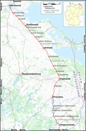 The line start at Angermünde station, where the line branches off to the north from the main line of the Berlin–Szczecin railway. It first runs along the Uckermark lakes and the adjoining Uecker river through Prenzlau to Pasewalk. The border between Brandenburg and Mecklenburg-Vorpommern is about 1800 metres north of Nechlin station. The line swings to the north northwest to Pasewalk and runs on a mostly straight course through the foothills of Ueckermünder Heide. In Ferdinandshof the line runs for a few hundred metres through an extension of the Friedländer Große Wiese (a largely drained bog). It passes through Ducherow, which until 1945 was the start of a branch line to Heringsdorf, and continues to Anklam. About five kilometres before Anklam station the line turns more to the northwest. The line runs through Züssow to Greifswald. The last section of the line to Stralsund runs at a distance of about five kilometres from the coast. Before Stralsund the line turns back to the north and ends at Stralsund Hauptbahnhof in the suburb of Tribseer.