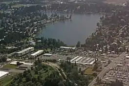 Angle Lake is an L-shaped lake in SeaTac, Washington, United States, occupying 102 acres (0.41 km2) between Interstate 5 and State Route 99. The lake most likely was so named on account of its outline.[2] On the western shore is a 10-acre (0.040 km2) park, Angle Lake Park, administered by the City of SeaTac Parks and Recreation department.[3] The remainder of the shoreline is ringed with private homes.