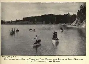 Prior to 1890, Shoshone Lake was barren of fish as Lewis Falls on the Lewis River was a barrier to upstream migration. In 1890, fisheries personnel planted lake and brown trout and created a popular fishery, especially for large brown trout in the fall.[40] The lake also contains the Utah chub which was probably inadvertently introduced by bait anglers in the 1950s. Brook trout were planted in several tributary streams and are occasionally found in the lake. Angling is restricted to fly fishing or artificial lures.[2] Boating on Shoshone Lake is restricted to hand-powered craft only, which means float tubes, kayaks or canoes.