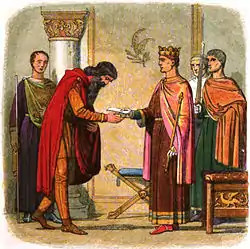 In 1166, Ruaidrí Ua Conchobair (Rory O'Connor), king of Connacht, was acknowledged as High King of Ireland by most of the Irish kings.[17] He led a coalition—that included Tigernán Ua Ruairc (Tiernan O'Rourke) of Bréifne (Breffny), Diarmait Ua Maelsechlainn (Dermot O'Melaghlin) of Míde (Meath), the Norse-Irish of Dublin, and several Leinster princes[17]—which ousted Diarmait mac Murchada (Dermot MacMurragh) as king of Leinster. Diarmait refusing to accept his fate sailed from Ireland on the 1 August for Bristol with his daughter Aoife[18] and sought help from Henry II in regaining his kingship. Henry gave Diarmait permission to recruit forces and authorised his subjects to help Diarmait, in return for Diarmait swearing loyalty to Henry. [19] Among other benefits, a loyal Diarmait restored to power would allow the fleet of Dublin to be used in Anglo-Norman campaigns against the Welsh and Scots.[20]