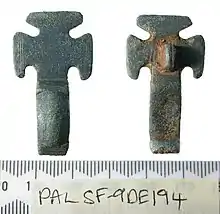 A cruciform brooch can be identified by three knobs or terminals on the head of the brooch. Cruciforms are usually cast in copper alloy, with the knobs often made separately. Cruciforms can range in ornamentation from simple to a more elaborate decoration.[18][19]