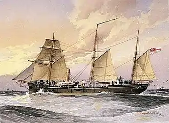During the bombardment a small naval engagement occurred when, at 09:05, the obsolete Glasgow fired upon the St George using her armament of 7 nine-pounder guns and a Gatling gun, which had been a present from Queen Victoria to the sultan.[37] The return fire caused Glasgow to sink, though the shallow harbour meant that her masts remained out of the water.[1] Glasgow's crew hoisted a British flag as a token of their surrender, and they were all rescued by British sailors in launches.[1] Thrush also sank two steam launches whose Zanzibari crews shot at her with rifles. Some land fighting occurred when Khalid's men fired on Raikes' askaris, with little effect, as they approached the palace.[1] The fighting ceased with the end of the shelling. The British controlled the town and the palace, and by the afternoon Hamoud bin Muhammed, an Arab favourable to the British, had been installed as sultan with much reduced powers.[38] The British ships and crews had fired around 500 shells, 4,100 machine gun rounds and 1,000 rifle rounds during the engagement.[39]