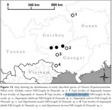 This species was first found in a soil sample of limestone rocks at the base of a cliff in Guangxi, China, off the cliffs at the southern edge of Jiaole Cun and is believed to live on the cavern walls of the limestone.[10]