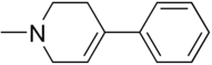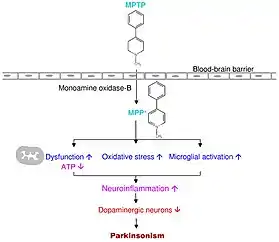 1-methyl-4-phenyl-1,2,3,6-tetraydropyridine (MPTP) is a widely used neurotoxin in Parkinson's disease research (Figure 4). In contrast to 6-OHDA, MPTP crosses the BBB which making the neurotoxin even more selective for dopaminergic neurons. Due to the ability to cross the blood-brain-barrier, MPTP is administered peripherally, subcutaneously. This neurotoxin is known to replicate oxidative stress, ROS, energy failure, and inflammation; which are all hallmarks in Parkinson's disease. However, it does not produce Lewy body pathology. The mechanism of action of MPTP is due to its conversion to 1-methyl-4-phenylpyridinium (MPP+) caused by the interaction of MPTP with monoamine oxidase B (MAO-B). (Figure5). MPTP enters astrocytes and is metabolized to MPP+ before being released. Once released into the extracellular space, MPP+ is taken up into the neuron by DAT and is stored in vesicles by the up take of vesicular monoamine transporter (VMAT2). In the neuron, MPP+ inhibits the function of complex 1 of electron transport chain, which decreases ATP production and releases ROS.