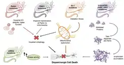 Pten-Induced Kinase 1 (PINK1) mutations are associated with autosomal recessive parkinsonism.[4] It is a neuroprotective kinase predominantly found in the mitochondria and cytoplasmic areas of the cell. PINK1 is also a serine/threonine protein kinase and is associated with the mitochondria.[20] PINK1, in research studies, is generally used as a knockout (KO) model. The mechanism of action of this gene involves the recruitment of the Parkin gene from the cytoplasm to the mitochondria. Once recruited, this leads to augmented ubiquitin activity and therefore induces mitophagy. Mitophagy is a pathway in which the mitochondria is degraded.[21] Both PINK1 and Parkin share functions in the same pathway, therefore, their activities are similar.[19] Some studies have demonstrated expression of the PINK1 mutation in rodents, inducing dopaminergic neuron loss and motor defects.[14] Other studies are more associated with PINK1 KO. PINK1 knockouts show reduction in dopamine levels in the striatum.[4] They express very low levels of dopaminergic neuron loss and do not present the formation of Lewy bodies. However, the KO models demonstrate mitochondria dysfunction and oxidative stress. On the other hand, studies are demonstrating loss of dopaminergic neurons and showing motor deficits in rats.[19]