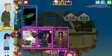 Turn-based gameplay consists of playing cards drawn from a virtual deck into the player's hand onto a tableau to fight against an AI playing cards from its own deck; depending on game mode the AI's deck may be system-generated or may belong to another player. Cards attack the card directly across from them and, if unopposed, attack the opponent's "hero" tower; the battle is won when the opponent's hero is defeated. A main tactic of card play is to play a character card and object card into the same slot to fuse into a more powerful combination ("combo") that the player has previously learned.[3] Cards are primarily images taken from one show, though some of the lowest-level cards are generic, such as "Alcohol", "Baseball", and "Music". Cards are played against a backdrop of a building or place from one of the shows.