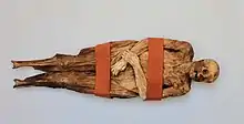 The woman was buried in a simple spruce wood coffin, her left hand holding her right arm above the wrist. The mummy was mostly intact: only the head and feet had decomposed while parts of her dress and hair were conserved. Her height was 142 cm. Skinfolds point at a stout body.