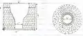 Evidence suggests that the original kiln had a single pot and arched entrances leading to three 'eyes', and that later two more pots were built with rounded tops to the arches which led to only two eyes each.[7] The decorative front of the new kiln has blind arches at either end and two quatrefoils, symmetrical shapes which form the overall outline of four partially overlapping circles of the same diameter.