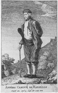 Annibal Camoux died in 1759 in Marseilles, at the claimed age of 121. Research, however, suggests he was born in 1669, meaning he was only 90 when he died.[2]