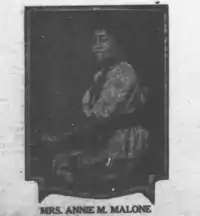 Annie Minerva Turnbo Malone (August 9, 1877[2][3] – May 10, 1957)[4] was an American businesswoman, inventor and philanthropist. She is considered to be one of the first African American women to become a millionaire.[5][6] In the first three decades of the 20th century, she founded and developed a large and prominent commercial and educational enterprise centered on cosmetics for African-American women.