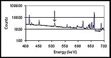 Annihilation radiation is not monoenergetic, unlike gamma rays produced by radioactive decay. The production mechanism of annihilation radiation introduces Doppler broadening.[2] The annihilation peak produced in a photon spectrum by annihilation radiation therefore has a higher full width at half maximum (FWHM) than decay-generated gamma rays in spectrum. The difference is more apparent with high resolution detectors, such as Germanium detectors, than with low resolution detectors such as Sodium iodide detectors.