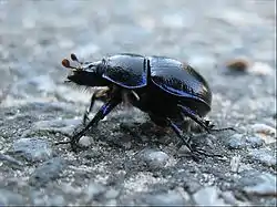 The adults of A. stercorosus grow up to 12–20 millimetres (0.47–0.79 in) long [4][6] and therefore they do not reach the length of the very similar common dung beetle (Geotrupes stercorarius). The body colour is blue-black, while the underside is usually metallic blue. The elytra have seven longitudinal slightly dotted grooves. The wings may be blue, violet or green. Antennae are reddish brown. Geotrupes stercorarius presents three keels on the outer side of the tibia of the third pair of legs, while A. stercorosus presents only two.