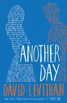 Another Day is a young adult romance and fantasy novel written by American author David Levithan. The novel was published on August 25, 2015 through Random House Children's Books.[1] Another Day is the companion novel to Levithan's popular teen romance novel, Every Day. Every Day establishes the story line through the perspective of "A", a mystical soul who falls in love with a girl named Rhiannon. Another Day features a similar story line; however, it is retold through Rhiannon's perspective. Both books were followed up by a sequel in 2018 entitled Someday that incorporates both A and Rhiannon's perspectives in different chapters along with a multitude of other perspectives.