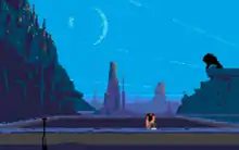 The game was influenced by works that Chahi liked at the time. The art and atmosphere were influenced by science fiction books such as Dune, artists such as Michael Whelan, and comic illustrators such as Richard Corben.[10] Manga such as Akira Toriyama's Dragon Ball influenced the way it suggests a lot with very little, character blurring effects such as the use of thin lines to suggest fast motion, and charging power attacks influenced by the Kamehameha.[11][12] The game's art style and atmosphere also drew influence from science fiction or fantasy art, including artists such as Frank Frazetta, Bernie Wrightson, and Zdzisław Beksiński, as well as the novel Hyperion. The laser blasters were also influenced by Star Wars.[12]