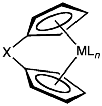 An ansa-metallocene is a type of organometallic compound containing two cyclopentadienyl ligands that are linked by a bridging group such that both cyclopentadienyl groups are bound to the same metal. The link prevents rotation of the cyclopentadienyl ligand and often modifies the structure and reactivity of the metal center. Some ansa-metallocenes are active in Ziegler-Natta catalysis, although none are used commercially.[1] The term ansa-metallocene (ansa being Greek for "handle") was coined by Lüttringhaus and Kullick to describe alkylidene-bridged ferrocenes, which were developed in the 1950s.[2]