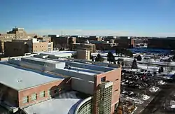 The Anschutz campus hosts administrative and teaching functions, as well as clinical and research programs with nearly 25,000 faculty, employees, and support staff.[42] The principal buildings on campus include the Fitzsimons Building (formerly Building 500), two Research Complex towers, two education buildings, the Fulginiti Pavilion for Bioethics and Humanities, the Barbara Davis Diabetes Center, the Nighthorse Campbell Native Health Building, Strauss Health Sciences Library, the Anschutz Health and Wellness Center, as well as the individual buildings for the Skaggs School of Pharmacy and Pharmaceutical Sciences, and the School of Dental Medicine. The Children's Hospital and the University of Colorado Hospital are located to the south of the campus.[43] The north part of campus consists of two bioscience buildings, which includes the Gates Biomanufacturing Facility.[44]