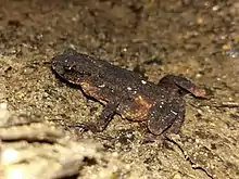 A small stream toad, measuring only 22-26mm in length.[2] Its natural habitat is near torrents in subtropical forest on sloping land.[3] It is threatened by habitat loss for agriculture, use by medical research (although this is not a significant threat) and by the introduced American bullfrog.[4] Though it is only known from Doi Inthanon National Park and Thongphaphum in Kanchanaburi Province,[5] it is not rare in suitable habitat. The species was recently discovered in a third locality, Doi Suthep National Park in Chiang Mai Province,[6] and may also exist in similar habitat in northern Thailand and adjacent Myanmar.