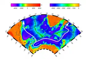 The Vema Channel, a deep trough in the Rio Grande Rise of the South Atlantic at 31.3°S 39.4°W, is an important conduit for Antarctic Bottom Water and Weddell Sea Bottom Water migrating north.[8] Upon reaching the equator, about one-third of the northward flowing Antarctic bottom water enters the Guiana Basin, mainly through the southern half of the Equatorial Channel at 35°W. The other part recirculates and some of it flows through the Romanche Fracture Zone into the eastern Atlantic.[9]
